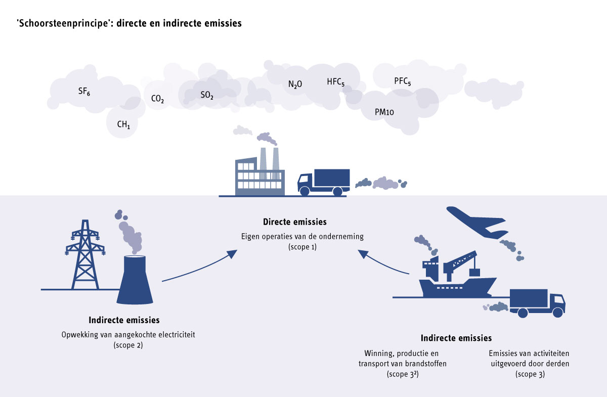Het kabinet streeft naar een verregaande reductie van CO2-emissie met als doel een CO2-arme gebouwvoorraad in 2050. In het regeerakkoord zijn voor de verschillende sectoren afspraken gemaakt over de verduurzaming van Nederland met als tussentijds streefdoel in 2030 een CO2-reductie van 49 procent en als einddoel 95 procent CO2-reductie in 2050 ten opzichte van het peiljaar 1990. Dit is verder uitgewerkt in het Klimaatakkoord en juridisch verankerd in de Klimaatwet. In het Klimaatakkoord van 28 juni 2019 is afgesproken dat de verschillende sectoren binnen het maatschappelijk vastgoed (utiliteitsbouw) de verantwoordelijkheid nemen om in een sectorale routekaart te onderzoeken op welke wijze en mate aan de CO2-emissiereductie doelstelling voldaan kan worden door gebouwgebonden maatregelen te treffen. Voor de gebouwde omgeving betreft de doelstelling primair het reduceren van de directe CO2-emissie. Vanwege de zogenaamde ‘schoorsteenbenadering’ (Figuur 1) worden alleen reducties van directe emissies in de gebouwenvoorraad toegerekend aan de sectortafel Gebouwde Omgeving, één van de vijf sectorale platformen waar vanuit het Klimaatakkoord afspraken zijn gemaakt om de CO2-uitstoot in Nederland te beperken. De doelstelling voor het reduceren van de indirecte CO2-emissie, ofwel de verduurzaming van de elektriciteitsproductie, wordt toegerekend aan de sectortafel Elektriciteit.